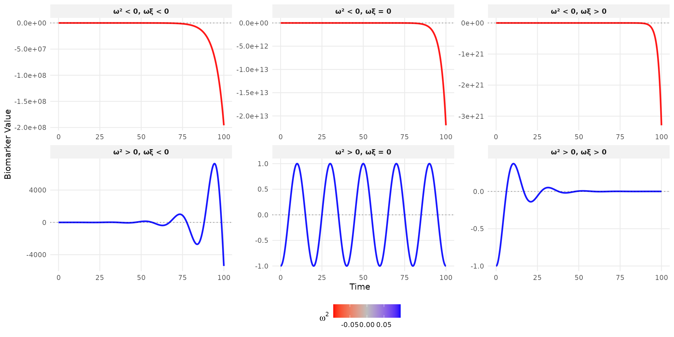 This analysis requires \omega^2 \geq 0 for real natural frequencies, focusing on stable or oscillatory systems that better represent biological reality. Systems with \omega^2 < 0 exhibit purely exponential divergence without oscillations and lack practical relevance for modeling physiological processes.