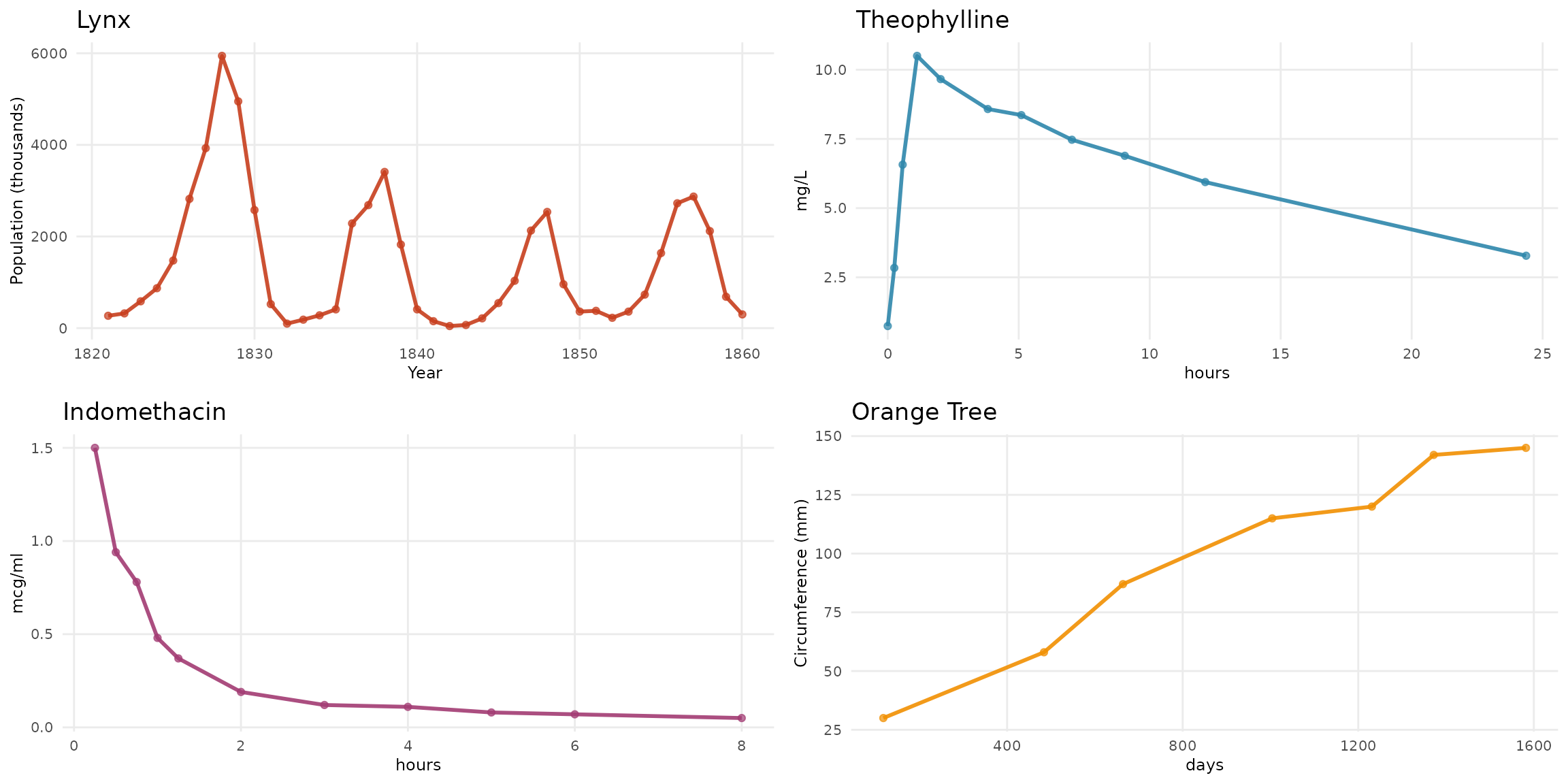 - Canadian Lynx (1821-1934): Annual trapping data showing predator-prey population cycles with pronounced oscillations
